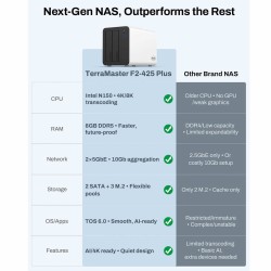 NAS TerraMaster F2-425 Plus jest przeznaczony dla entuzjastów technologii i małych biur. Charakteryzuje się doskonałą konfiguracją sprzętową z 8 GB pamięci DDR5 i dwoma portami 5GbE, zapewniającymi wyjątkową wydajność. Wbudowana funkcja zarządzania zdjęciami oparta na sztucznej inteligencji porządkuje wspomnienia bez konieczności przesyłania ich do chmury, zapewniając pełną prywatność. Dzięki ogromnej pojemności 84 TB urządzenie bez trudu centralizuje dane, jednocześnie usprawniając współpracę zespołową. Wielowarstwowe zabezpieczenia zapewniają niezawodną ochronę danych bez obaw.