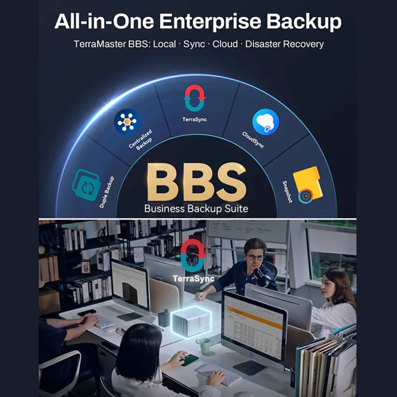 BBS to opracowane przez firmę TerraMaster rozwiązanie do tworzenia kopii zapasowych dla przedsiębiorstw, przeznaczone do wszystkich scenariuszy. Jego podstawowe moduły współpracują ze sobą, tworząc kompleksowy system ochrony danych: