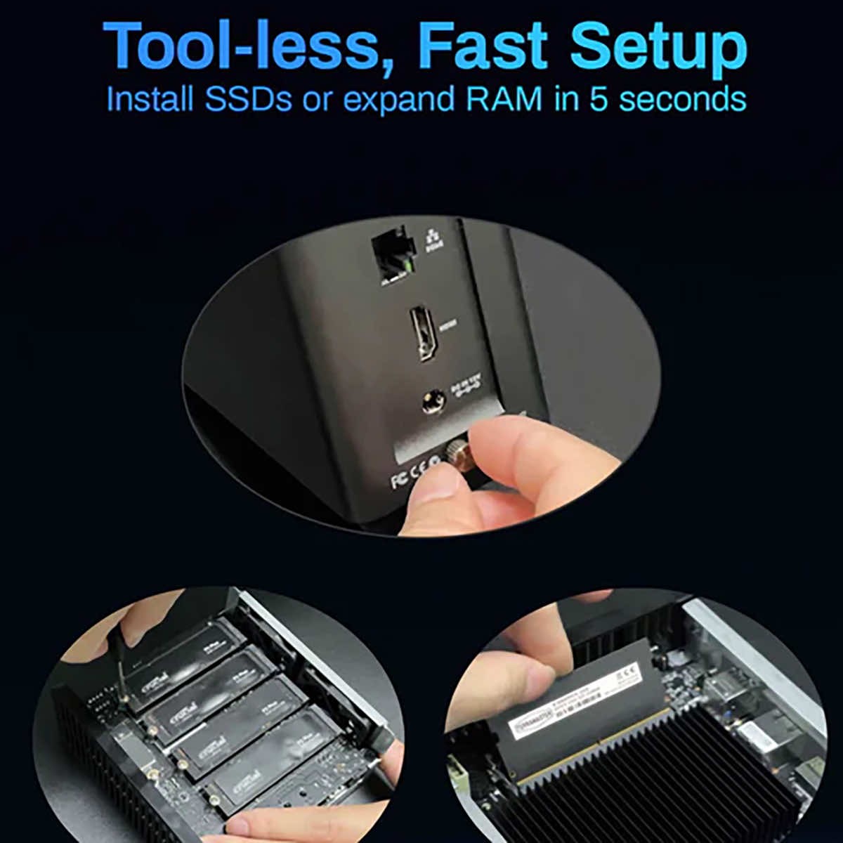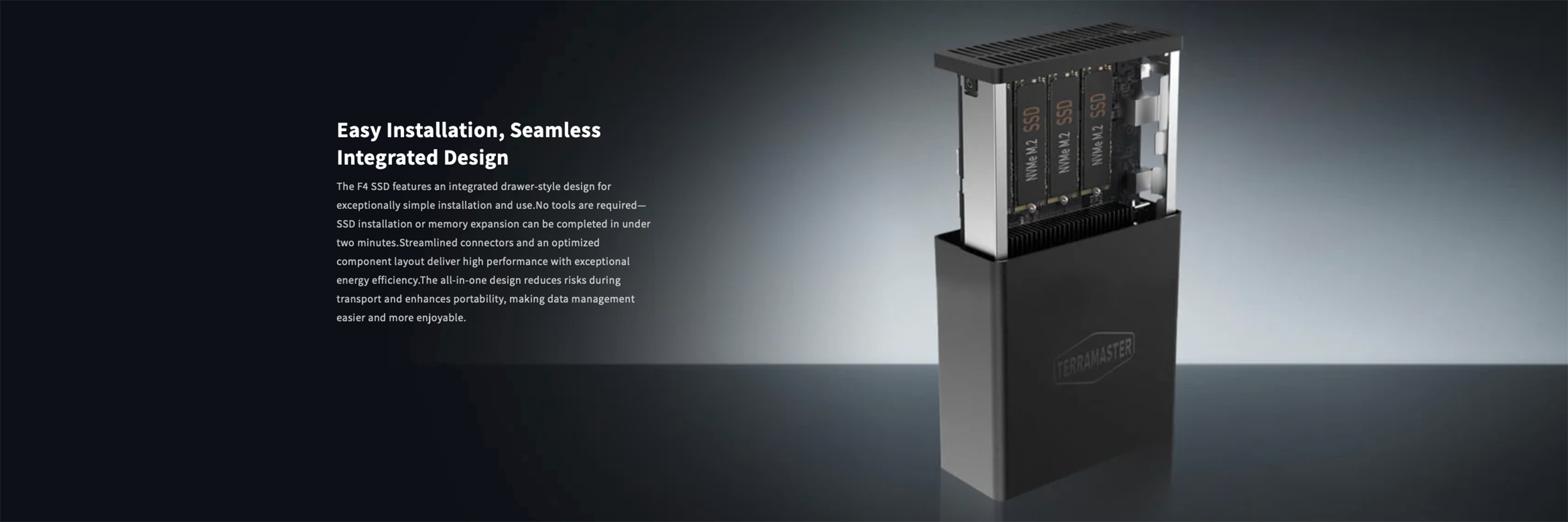 Dysk SSD F4 charakteryzuje się zintegrowaną konstrukcją typu szufladowego, która zapewnia wyjątkowo prostą instalację i obsługę. Nie są wymagane żadne narzędzia — instalacja dysku SSD lub rozszerzenie pamięci można wykonać w mniej niż dwie minuty. Usprawnione złącza i zoptymalizowany układ komponentów zapewniają wysoką wydajność przy wyjątkowej energooszczędności. Konstrukcja typu „wszystko w jednym” zmniejsza ryzyko podczas transportu i zwiększa przenośność, dzięki czemu zarządzanie danymi jest łatwiejsze i przyjemniejsze.