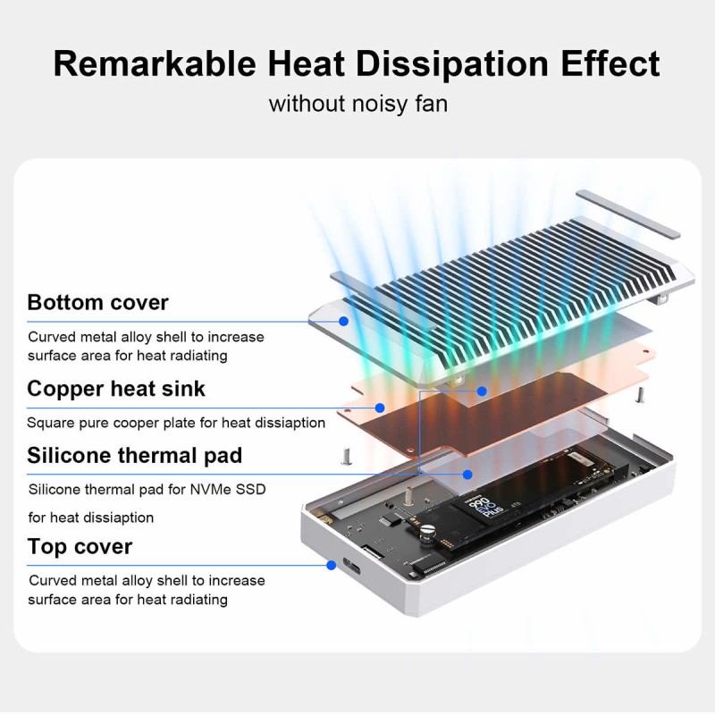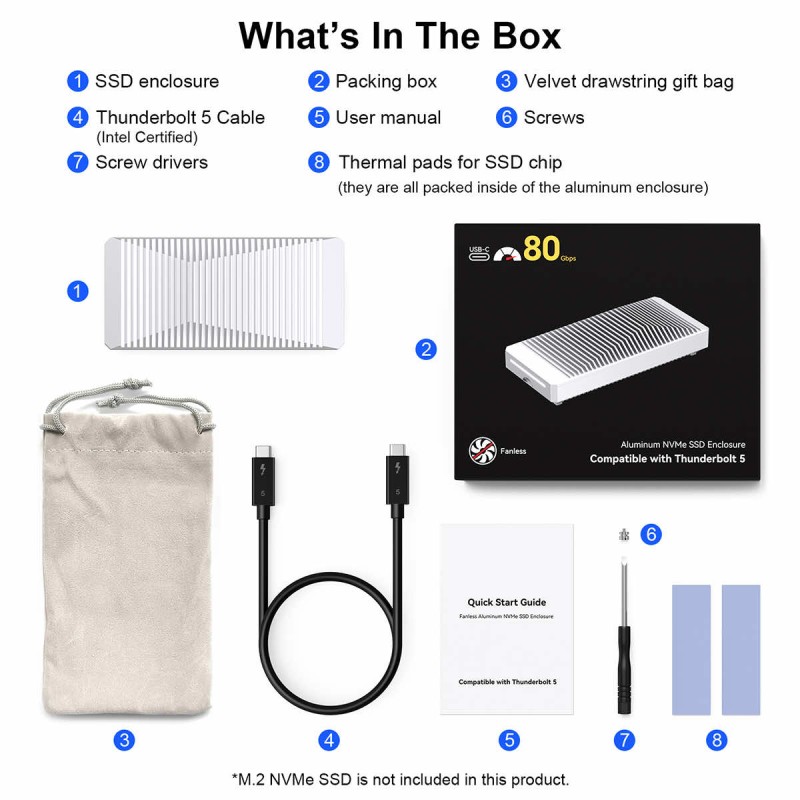 - W zestawie: obudowa, termopad, kabel Thunderbolt™ 5 80Gb/s 0,5m, pokrowiec na kieszeń, śrubokręt.