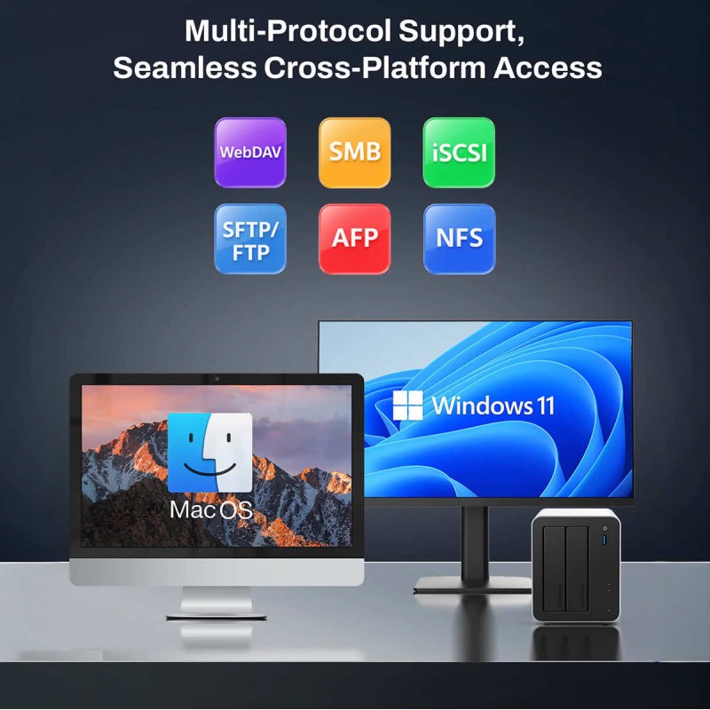 Supports mainstream protocols including SMB, NFS, SFTP/FTP, AFP, iSCSI, and WebDAV. Flexible permissions based on users, groups, and directories enable secure, cross-platform file sharing across diverse network environments.