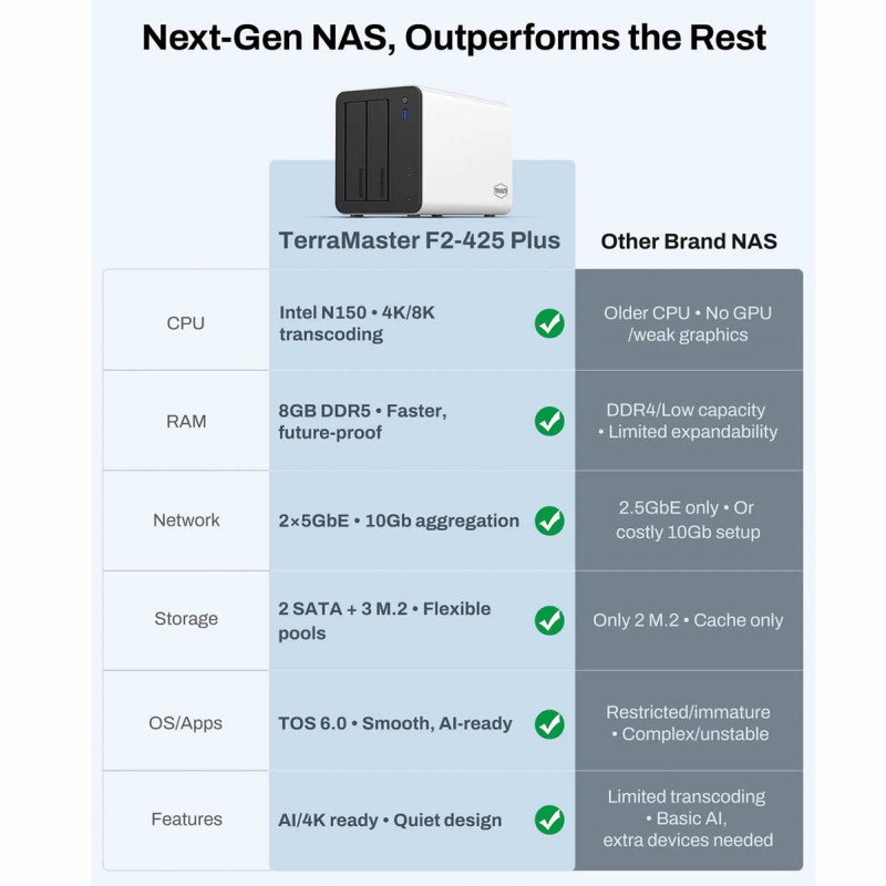 NAS TerraMaster F2-425 Plus is designed for geek enthusiasts and small offices, featuring outstanding hardware configuration with 8GB DDR5 memory and dual 5GbE ports for exceptional performance. Its on-device AI photo management organizes memories without cloud uploads, ensuring complete privacy. With massive 84TB storage, it centralizes data effortlessly while enhancing team collaboration. Multi-layered security provides reliable, worry-free data protection.