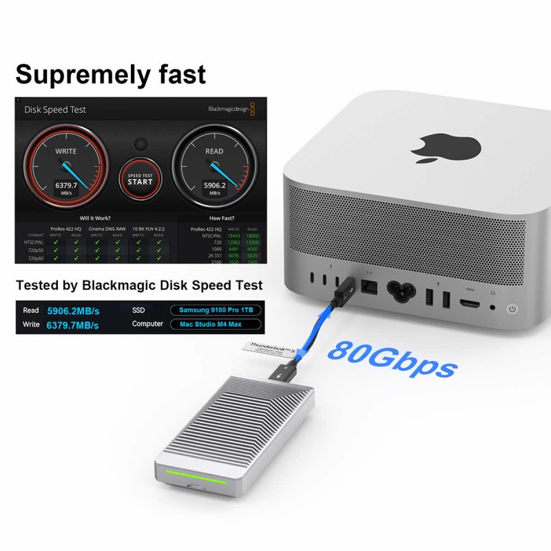 High transfer speeds of up to 80Gb/s make the enclosure ideal for use with computers equipped with a Thunderbolt 5 port, such as Apple Macs with M4 Pro, M3 Ultra, and M4 Max processors.