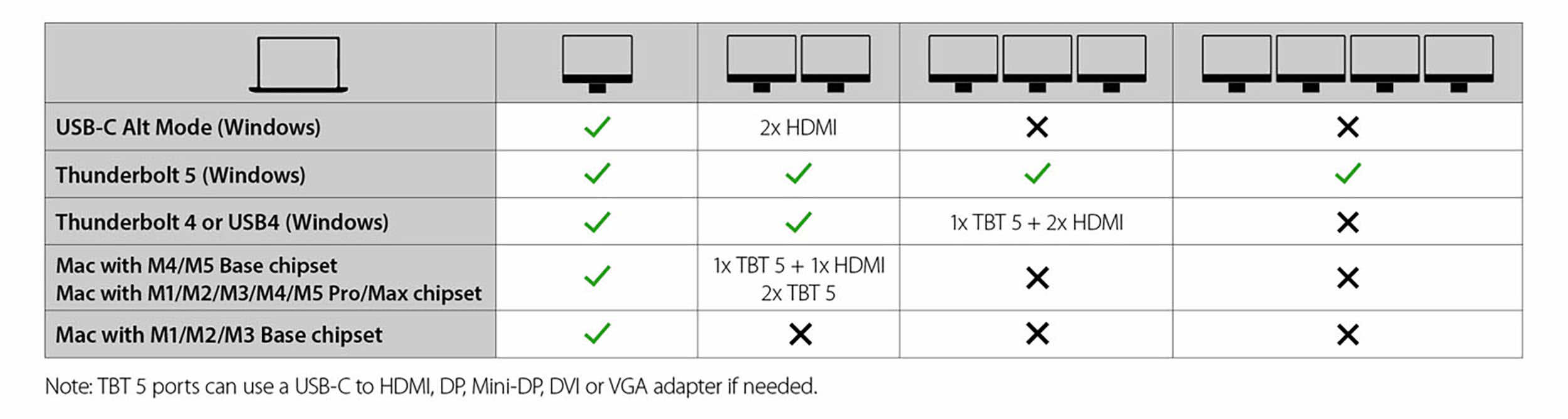 - Supports two external monitors with up to 8K@60 Hz via Thunderbolt 5 & HDMI (macOS) or up to four monitors (Windows OS)