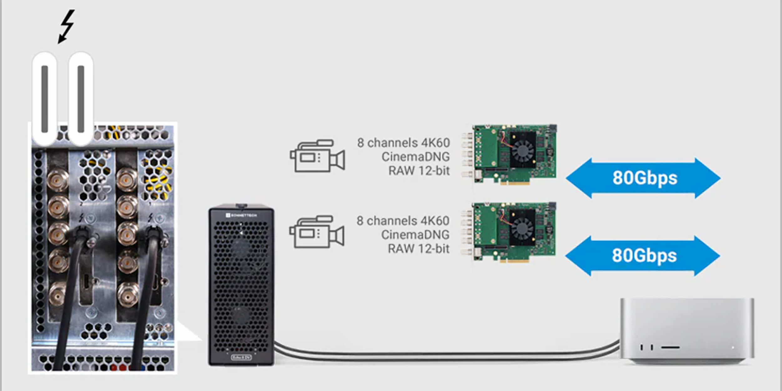 Also works with computers with only one available Thunderbolt port to support two cards.