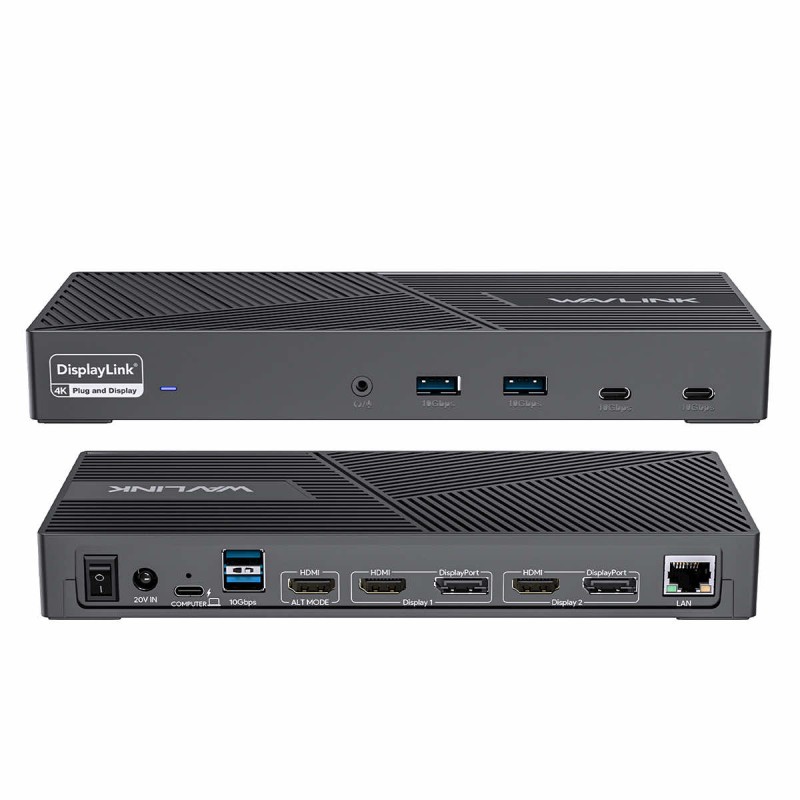The Wavlink WL-UG69PD25 PRO docking station uses DisplayLink technology, which offers excellent compatibility with a wide range of devices capable of running DisplayLink software. It features two DisplayPort 1.4 ports and three HDMI ports, and supports up to three 4K displays. A USB-C interface is used to connect the computer, which can charge the connected device with up to 100 W of power. Two USB-C ports and four USB Type-A ports support data transfer at 10 Gbps. Additionally, the Wavlink WL-UG69PD25 PRO docking station is equipped with one 1 Gbps RJ45 Ethernet port and one 3.5 mm combo jack. Thanks to DisplayLink technology and fast additional interfaces, the Wavlink WL-UG69PD25 PRO docking station offers exceptional convenience.