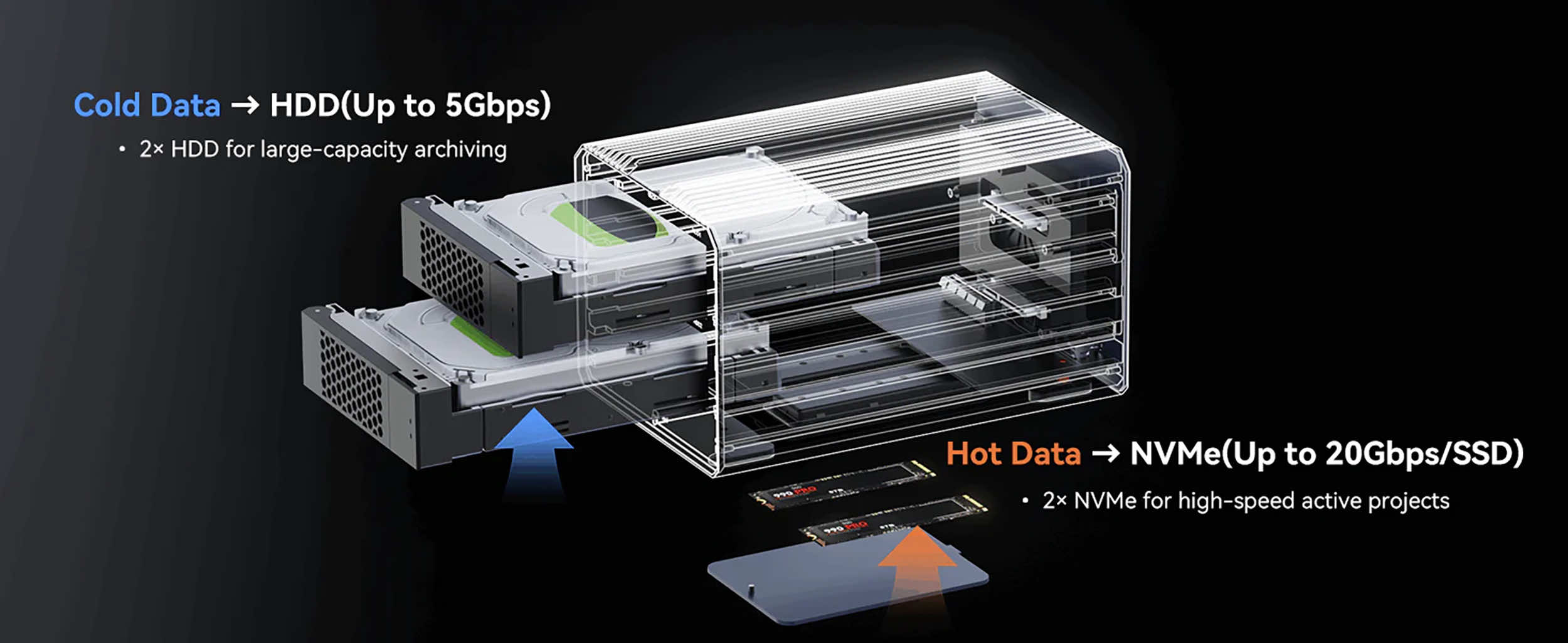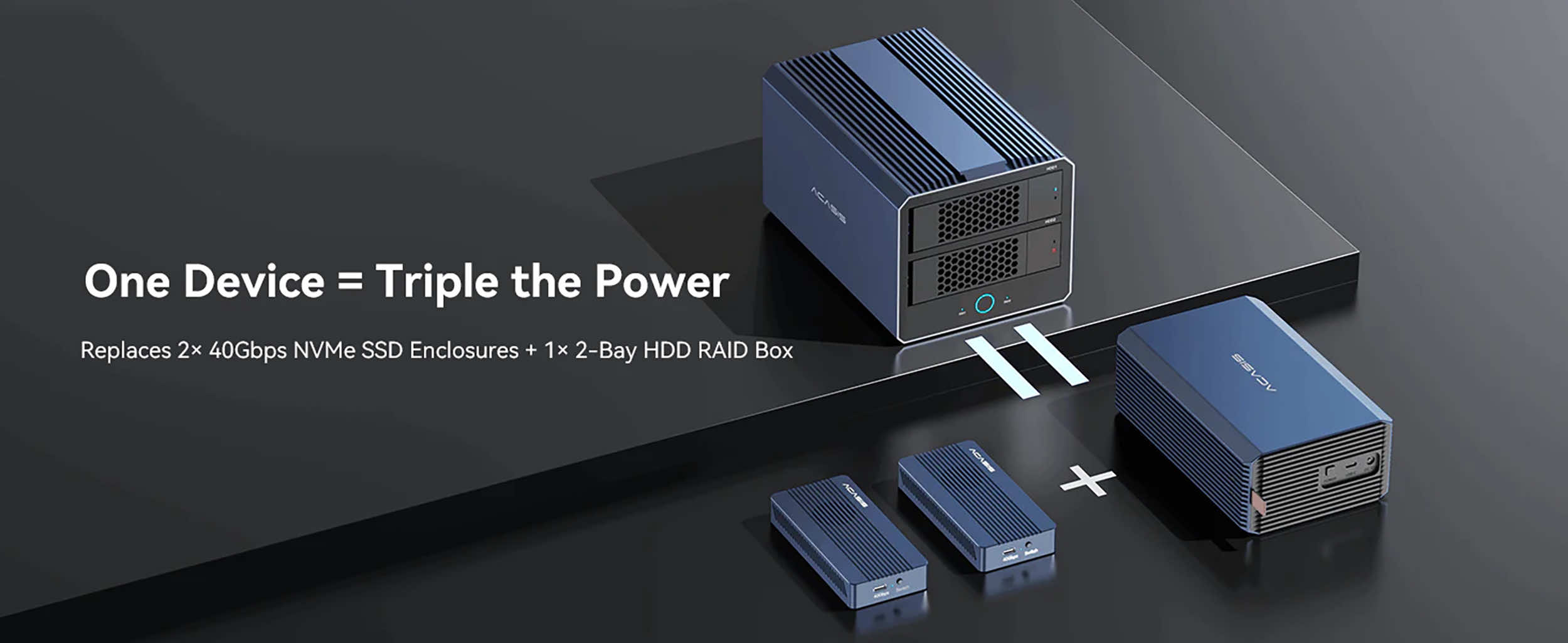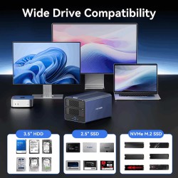 Oszczędzaj miejsce, koszty i czas potrzebny na konfigurację. Zamiast kupować trzy osobne obudowy, wybierz to urządzenie, które oferuje wszystko w jednym — 2 dyski SSD NVMe + 2 kieszenie na dyski HDD w jednej obudowie.