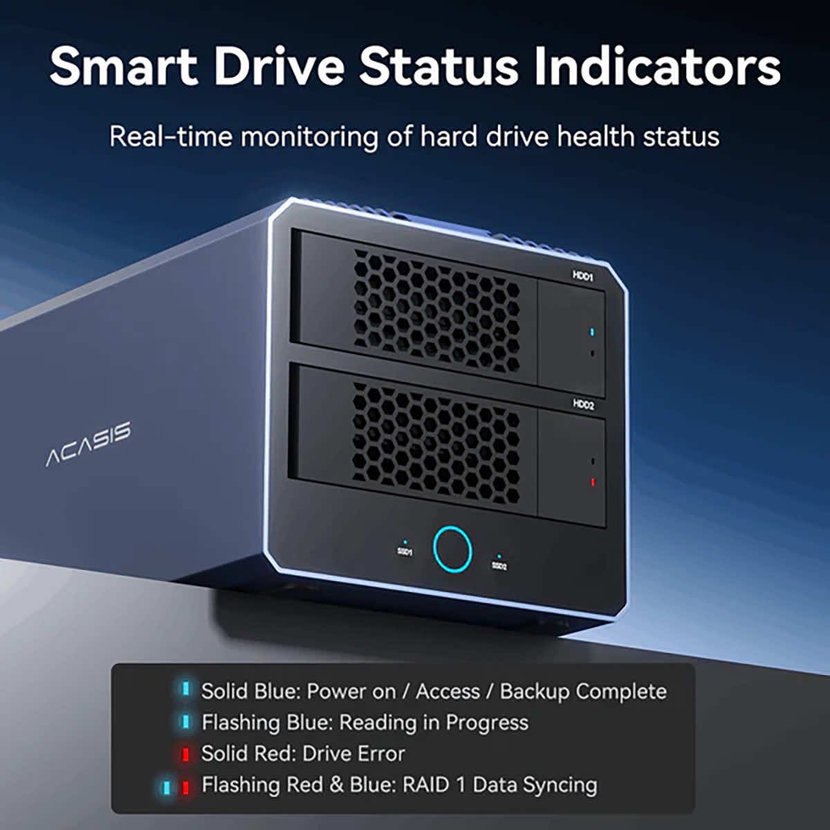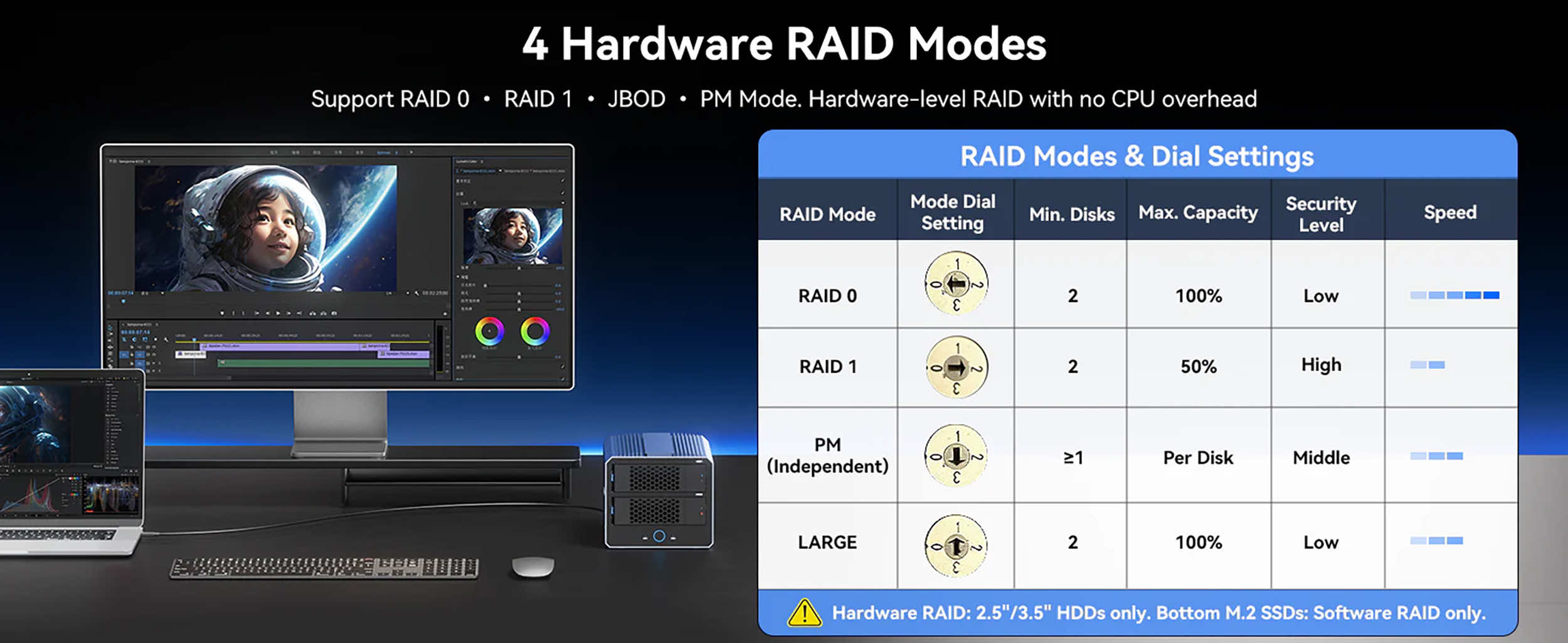 Elastyczny sprzętowy macierz RAID z 4 trybami pracy. Obsługuje tryby RAID 0, RAID 1, JBOD i PM, umożliwiając wybór najlepszej równowagi między szybkością, ochroną danych i elastycznością przechowywania.