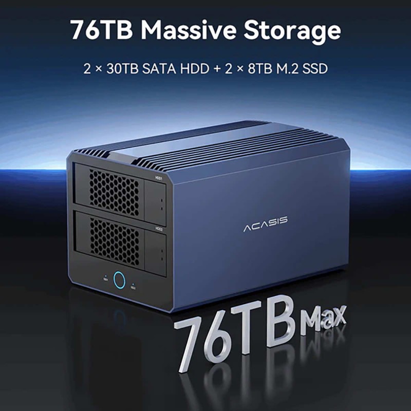 - Pamięć masowa o pojemności do 76 TB – łatwe przechowywanie dużych plików i kopii zapasowych.