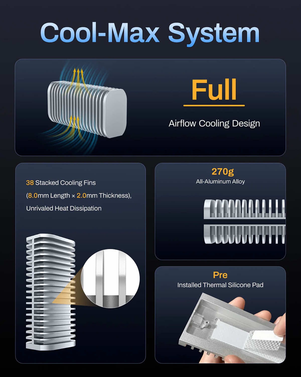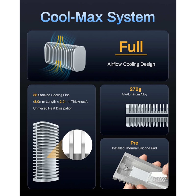 Zaprojektowany z myślą o bezgłośnej pracy bez wentylatora, dysk SSD Pro D1 posiada całkowicie aluminiową obudowę, która działa jak wydajny radiator, szybko pochłaniając i rozpraszając ciepło. Nawet przy dużym, długotrwałym obciążeniu — takim jak przesyłanie dużych plików lub edycja wideo — jego rozległa powierzchnia chłodząca utrzymuje idealną temperaturę roboczą około 36–49°C, zapobiegając przegrzaniu. Zapewnia to cichą, niezawodną i szybką pracę, dzięki czemu możesz całkowicie skupić się na swojej pracy.